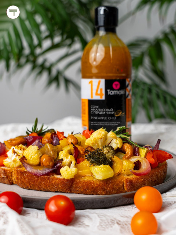 Выложите запечённые овощи на хлеб, полейте соусом чили с ананасом.