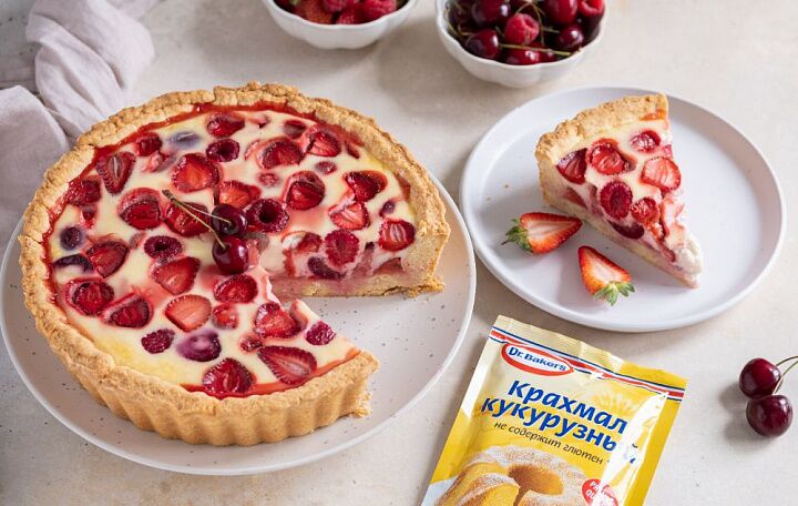 Добавляем яйца (2 шт.), сахар (50 г) и щепотку соли и быстро замешиваем тесто. Формируем из теста шар, оборачиваем его плёнкой и отправляем в холодильник на 30 минут.Для начинки яйца (2 шт.) взбиваем с сахарной пудрой (60 г) и ванильным сахаром (8 г) до однородности. Добавляем сметану (400 г) и перемешиваем. Всыпаем крахмал (30 г), смешиваем до однородного состояния.
