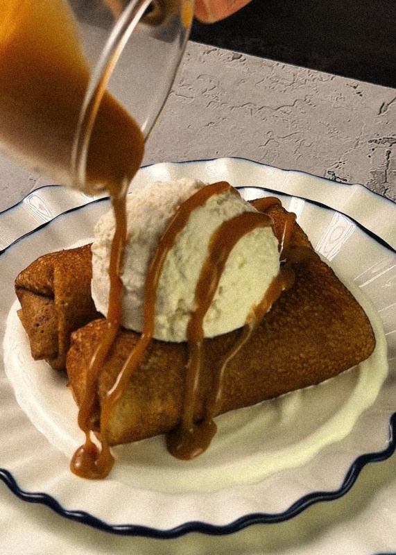 в блин - творог, сверху - яблоки, немного карамели и шар творожного крема (в начинку добавить еще творожного сыра до более кремовой текстуры)
