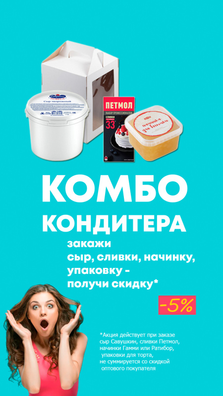 *акция действует на товары в любой фасовке, начинки или сгущенное молоко бренда "Гамми" и "Ратибор", упаковка из раздела "Упаковка для торта".