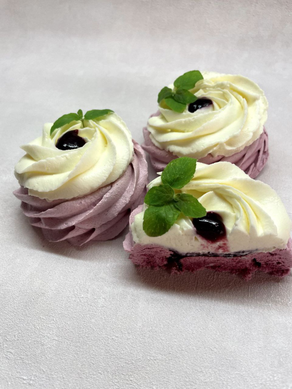Сборка: центр меренги обмазываем кремом, туда же кладем конфитюр и отсаживаем розочки из крема. Украшаем листиками мяты и конфитюром, можно сезонными ягодами смородины.
