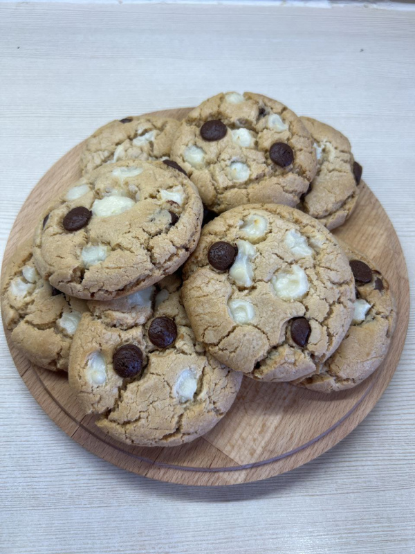 Жидкие ингредиенты смешать. Добавить сухие. взбить лопаткой 6 минут. Добавить шоколад и перемешать. Скатать колобки положить на пергамент на расстоянии друг от друга. Осадить из кондитерского мешка дели чизкейк. Выпекать при температуре 180г 20минут.
