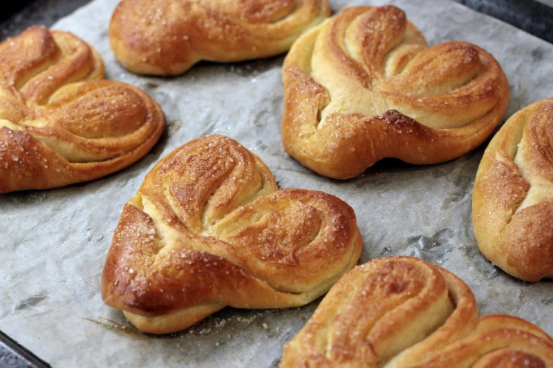 Перед выпечкой смазываем смесью из 50 г яиц и 50 г молока 3,5% "Чудское озеро". Сверху посыпаем сахаром. Выпекаем 13-15 минут при температуре 170С. Ориентируйтесь по цвету плюшек - он должен быть янтарно-золотистым