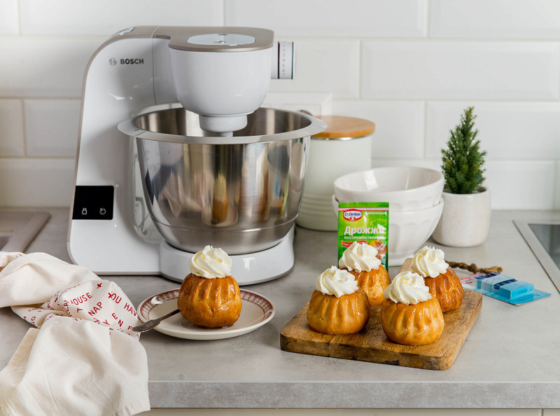 8.Перекладываем сливки в кондитерский мешок и украшаем ими наши ромовые бабы.