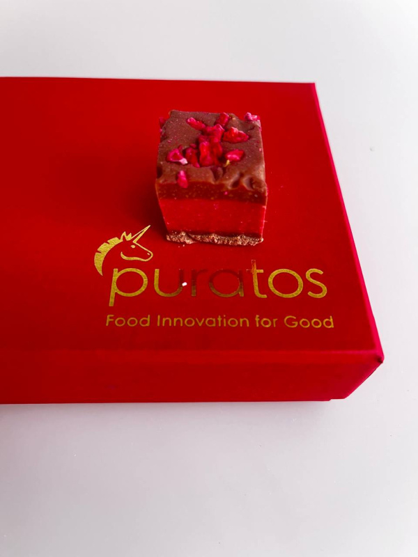 Технология: молочный лавандовый ганаш охладить, раскатать на ламинаторе между двумя ковриками, положить на 20 минут в холодильник. Разделить на 2 равные части. На одну часть поставить металлическую раму и на пласт выложить малиновую начинку, разровнять. Накрыть вторым пластом. Декорировать сублимированной малиной. Можно немного заморозить, снять рамку и порезать на конфеты.