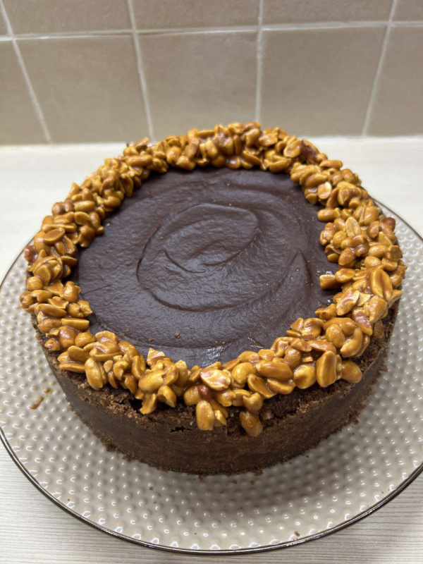 Поливаем чизкейк глазурью из сливок и шоколада, и оформляем ободком из арахиса в карамели.