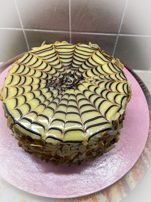 Сборка: собираем коржи с кремом, последний слой выравниваем остатками крема. Оставляем для стабилизации в холодильник на 6 часов. Обмазываем кислым джемом по желанию. Сверху покрываем глазурью из белого шоколада и сливок ( Сливки нагреваем и растворяем шоколад). Молочным шоколадом делаем спиральный рисунок и рисуем паутинку с помощью зубочистки. Края обсыпаем жареными лепестками миндаля.