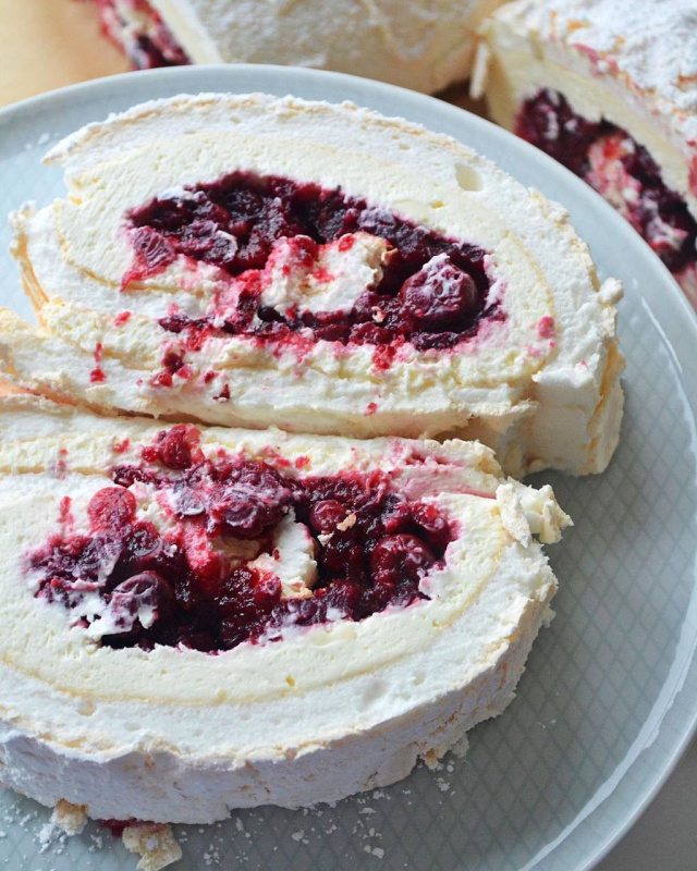 Меренговый рулет с маскарпоне и вишнево-брусничным конфи