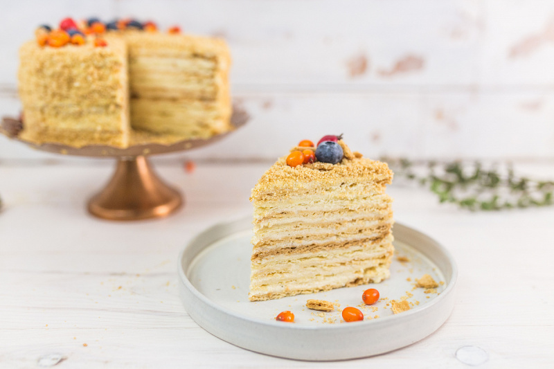 12.Убираем в холодильник на ночь или на 6–8 часов. Готовый торт Наполеон получается очень вкусным и нежным. Приготовленный по классическому рецепту, он станет украшением любого праздничного стола. Приятного аппетита!