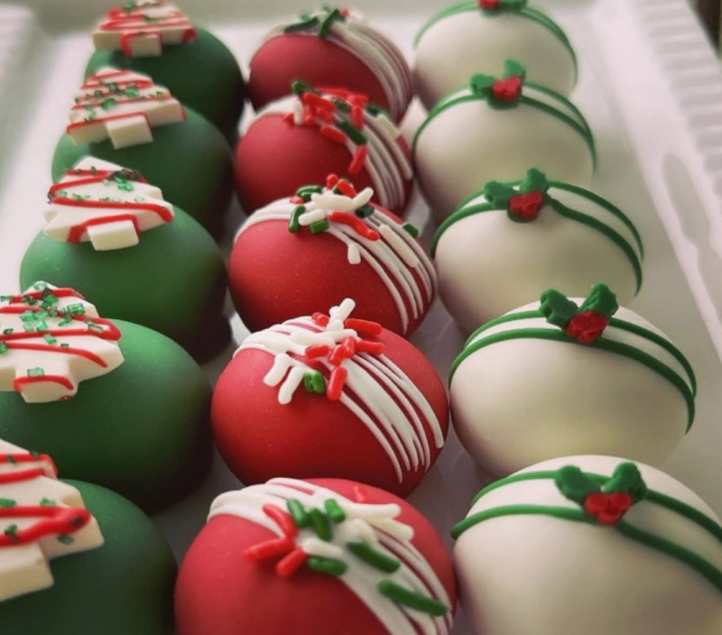 Глазурь растопить импульсами в микроволновке до 42 градусов, разделить на 3 емкости и окрасить в зеленый, красный цвет. При помощи шпажки проткнуть немного замороженный шар — заготовку и окунуть в глазурь. Положить на силиконовый коврик для застывания. Украсить новогодними посыпками или окрашенной глазурью. Положить шарики в капсулу и красивую упаковку.