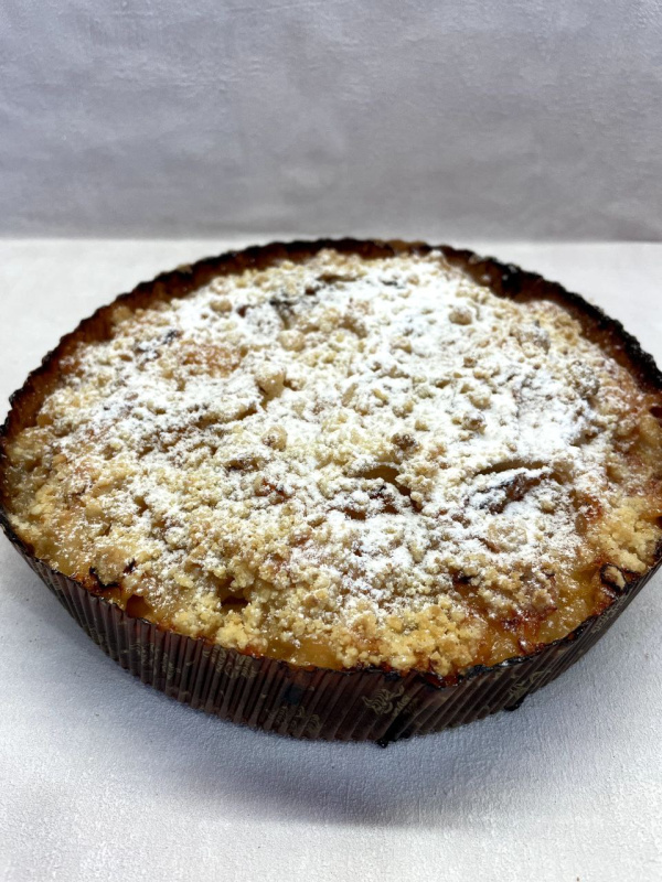 посыпку делаем смешав муку, сахар и сливочное масло в крошку. И посыпаем пирог