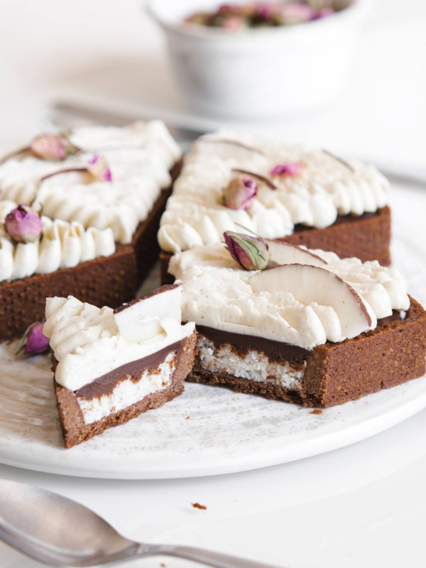 Шоколад залить горячими сливками, пробить блендером до однородности. Добавить растопленный желатин. Влить холодные сливки, пробить блендером ещё раз.