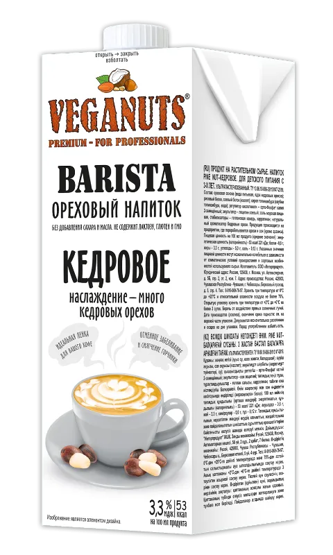 Состав: ореховая основа (вода питьевая, ядра орехов фундука); рисовый белок, соевый белок (изолят); сироп топинамбура (клубни топинамбура, вода); регулятор кислотности - орто-Фосфат калия 2-замещённый; эмульгатор - лецитин соевый; соль морская пищевая, стабилизаторы - геллановая камедь, каррагинан; натуральный ароматизатор Фундуковый. Продукция производится на предприятии, где перерабатываются орехи и соя (кроме арахиса).