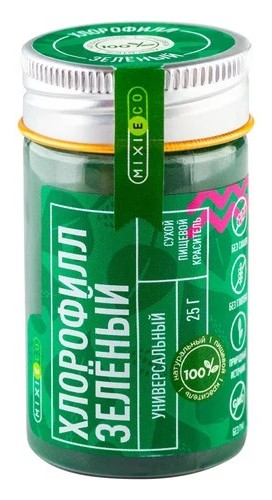 Не имеет вкуса и запаха и не меняет текстуру изделия при смешивании.Краситель изготовлен из экстракции растительного продукта - именно хлорофилл окрашивает листья растений в зеленый цвет.
